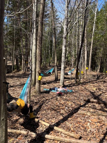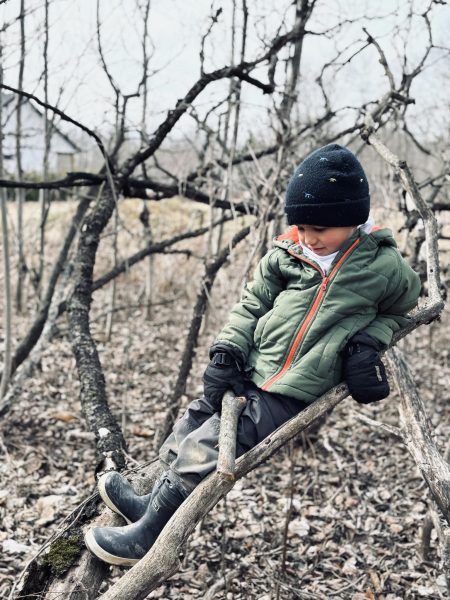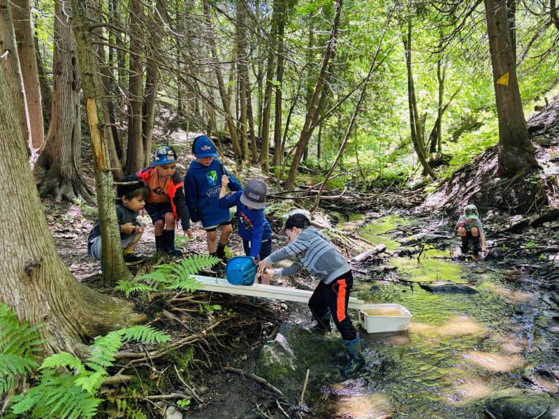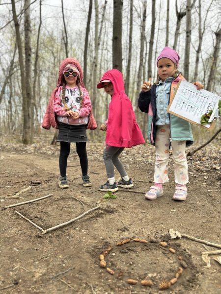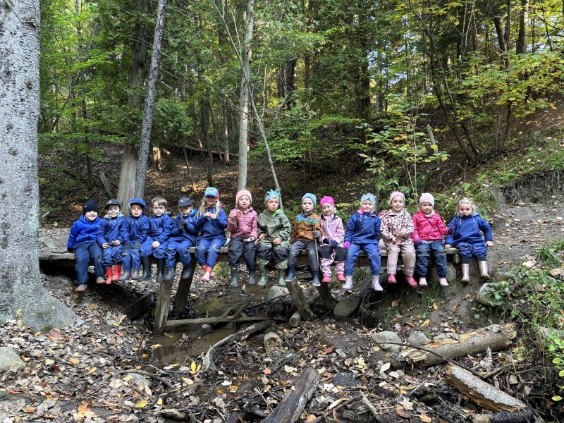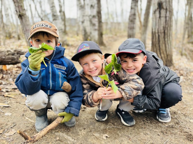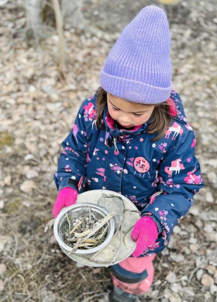 Énormément d’exploration en forêt, observation d’insectes, de petites bêtes, de champignons, de fleurs… Exploration du ruisseau, de la science, de la “cuisine” avec l’eau. (MUD kitchen) Beaucoup de lectures d’histoires et nous recréons par la suite l’histoire en mouvement… Des JEUX DE RÔLES (mon thème préféré: les pirates) Des chasses au trésor, la chasse aux lettres, la pêche aux rimes, la chasse aux formes. Construction de pièges à lutins, de cabanes, de bateaux… Des feux de camp, une soupe aux lettres sur le feu, faire cuire des rôties et les tartiner avec notre beurre fait par les petits… Jardin de tulipes, de tournesols, de fines herbes… Nourrir les oiseaux, suivre les traces d’animaux…